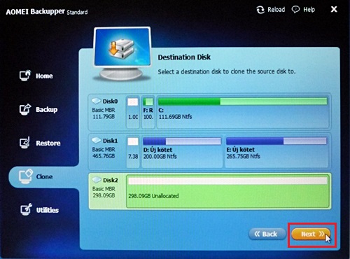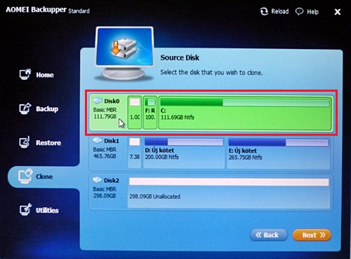 2. Először ki kell választani azt a tárolót amit klónozni szeretnénk (jelen esetben ez a Disk 0), majd rá kell kattintani a "Next"-re.