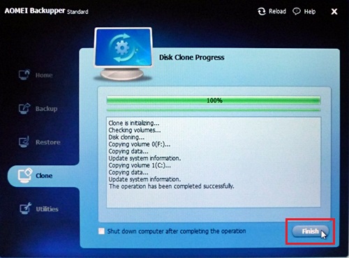 5. Ha lefutott a klónozás, akkor a Finish gombra kell kattintani, ekkor az újabb ablakban a klónozás adatai lesznek láthatóak.