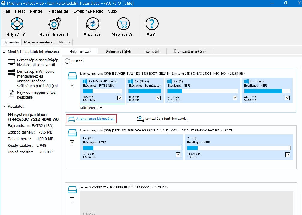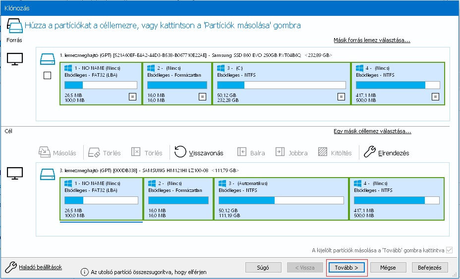tartozó partíciókat (pl. Windows7-nél C+100MB) szeretnénk átklónozni,